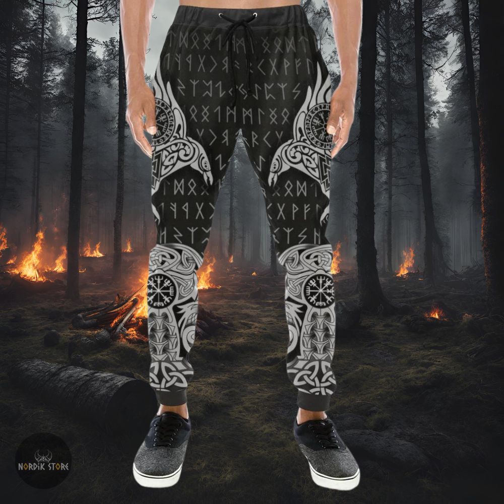 Notre collection de pantalons de style viking médiéval vous propose aussi de découvrir le pantalon viking Ragnar pour homme. Ce pantalon noir se pare de nombreux symboles vikings comme le Valknut, le Vegvisir mais aussi le magnifique corbeau du célèbre guerrier viking. Ce vêtement est doté d’un cordon au niveau de la taille afin de pouvoir s’adapter à toutes les morphologies. Son style urbain et décontracté vous permettra de porter ce pantalon en de nombreuses circonstances. Sans oublier ses poches amples pour que vous puissiez porter un pantalon viking très fonctionnel.