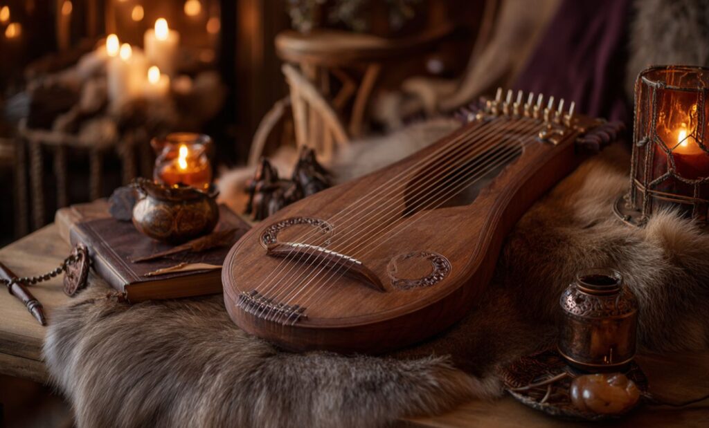 Chez eux, la vraie star, c’est la poésie. Les scaldes composent, mémorisent, déclament devant des salles entières suspendues à leurs lèvres. Odin lui-même n’est pas dieu de la musique, mais maître de la parole sacrée. La musique, elle, se glisse partout ailleurs. Elle accompagne les mots, les gestes, les voyages, les sacrifices, les veillées, les jeux d’enfants. Elle n’a pas de trône, mais elle a le terrain.