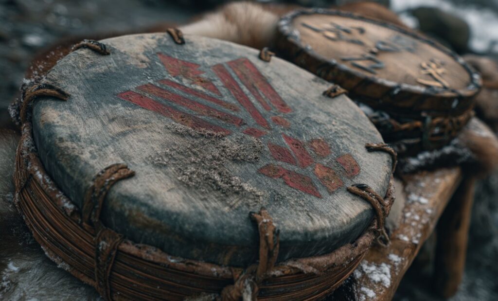 Mais ce silence archéologique ne dit pas tout. Les Vikings côtoyaient les Samis, leurs voisins du Nord, dont les tambours chamaniques — appelés goavddis ou gievrie — sont parfaitement attestés. Peaux de renne tendues, symboles cosmiques peints, rythmes utilisés pour la transe ou la communication spirituelle : ces instruments faisaient partie intégrante des pratiques des noaidis, les chamanes traditionnels.