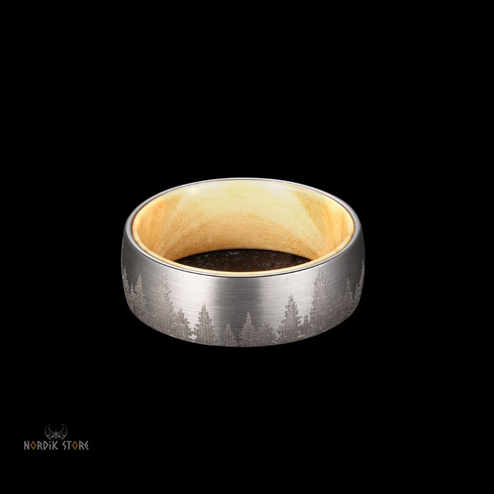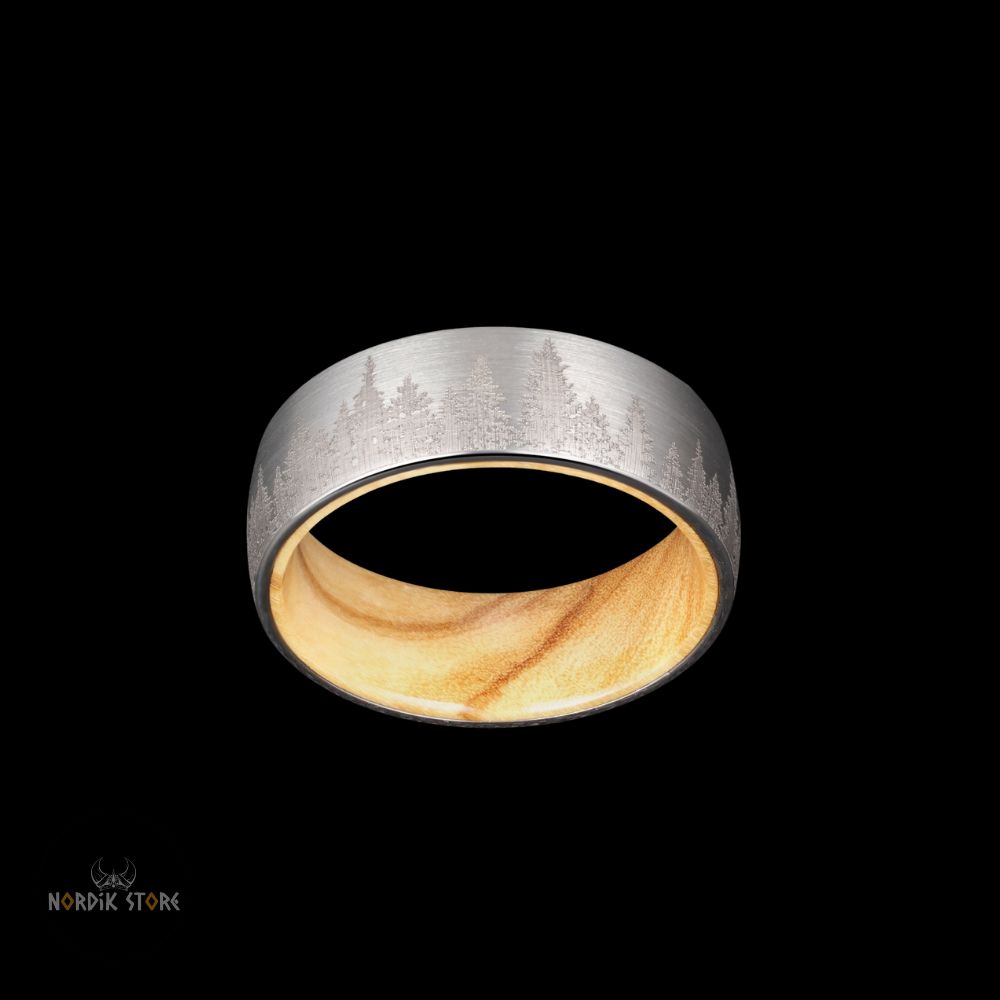Portez un fragment de forêt nordique. La bague viking bois des Fjords mêle tungstène puissant et bois sacré pour un style brut et majestueux.