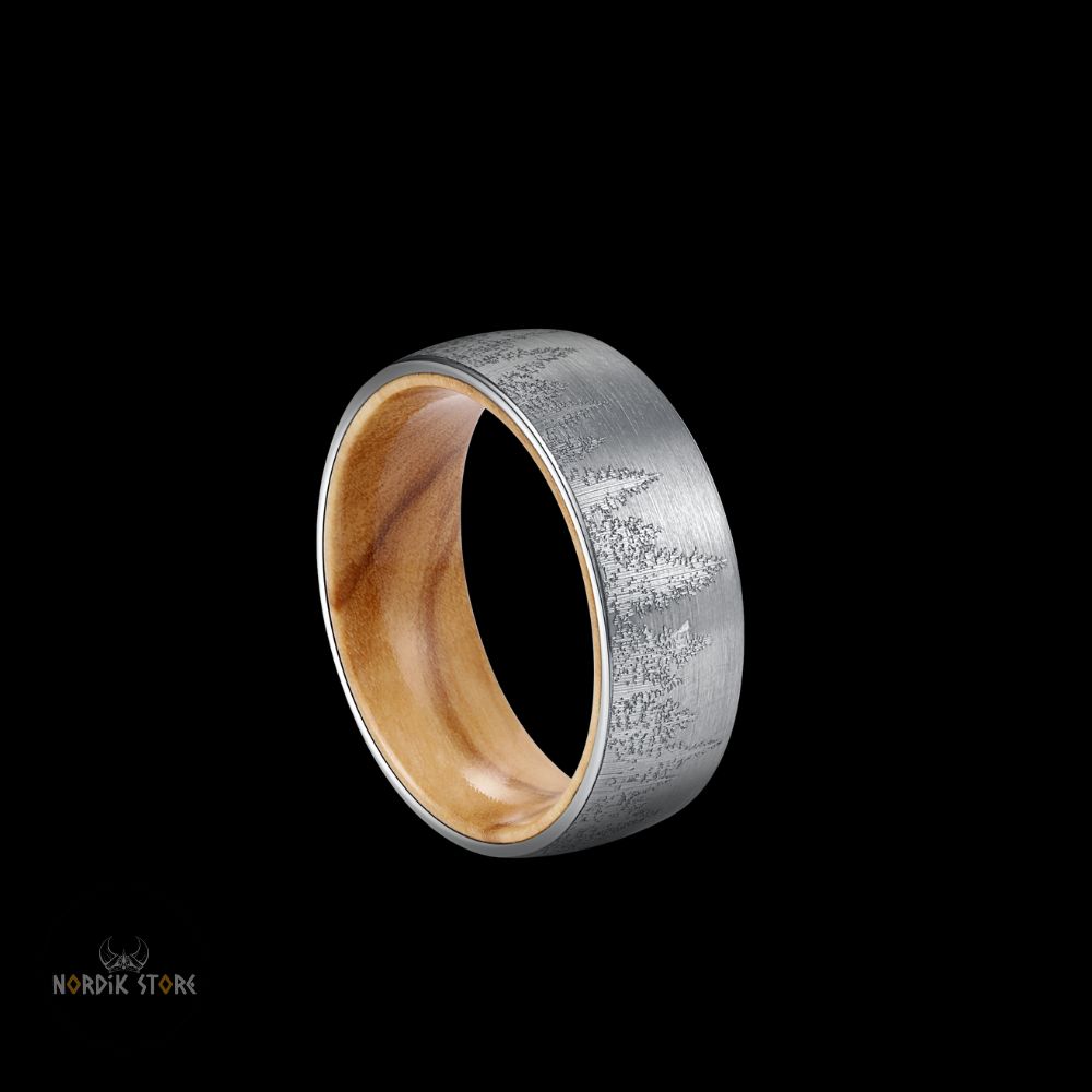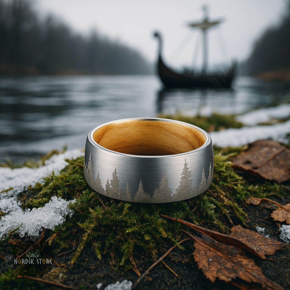 Découvrez la bague viking bois des Fjords, un anneau qui semble naître au cœur d’une forêt nordique battue par le vent. Imaginez un guerrier silencieux avançant entre les troncs sombres, la main posée sur un bijou mêlant métal et bois sacré. Grâce à sa finition mate et à son mélange rare de tungstène argenté et de bois d’olivier, cette bague capture l’âme brute des fjords. Elle respire la force, la nature, et cette sagesse tranquille que les anciens Vikings associaient aux arbres éternels.