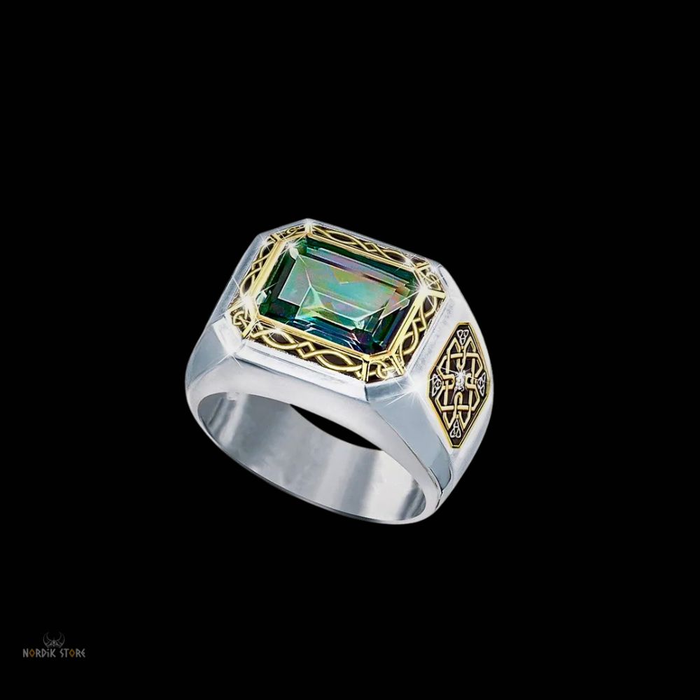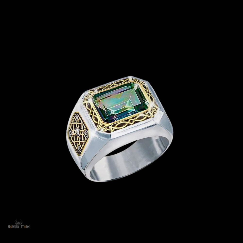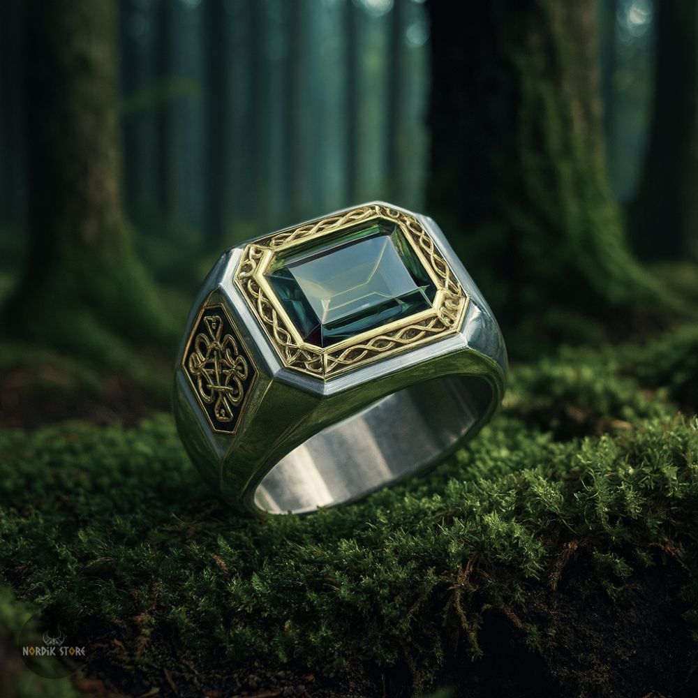 Faites en acier inoxydable de haute qualité, cette bague arbore des gravures d'entrelacs et de noeuds vikings - une représentation artistique de l'histoire complexe de Harald. La pierre d'émeraude synthétique en son centre est un symbole vibrant d'amour et de vie, et représente le printemps plein de vitalité.