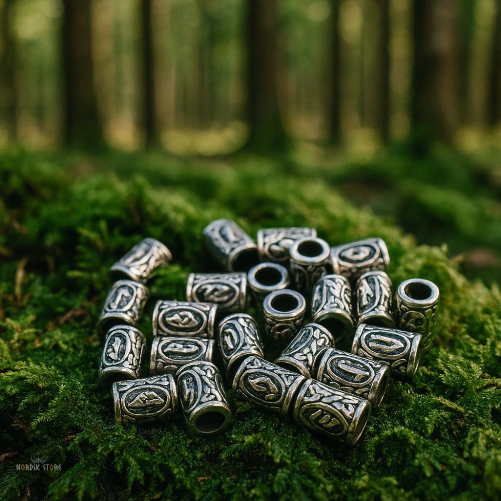 La nuit s’étire, un feu crépite, la fumée danse parmi les étoiles. Un homme se tient devant le miroir, barbes longues, doigts rugueux. Il assemble les perles d’acier gravées : vingt-quatre runes anciennes, chacune un chant, chacune un pacte. Ces bijoux ne sont pas de simples ornements ; ce sont des reliques de sang, des fragments des sagas vikings. En les glissant autour de votre barbe, vous ne portez pas un accessoire : vous portez la mémoire.