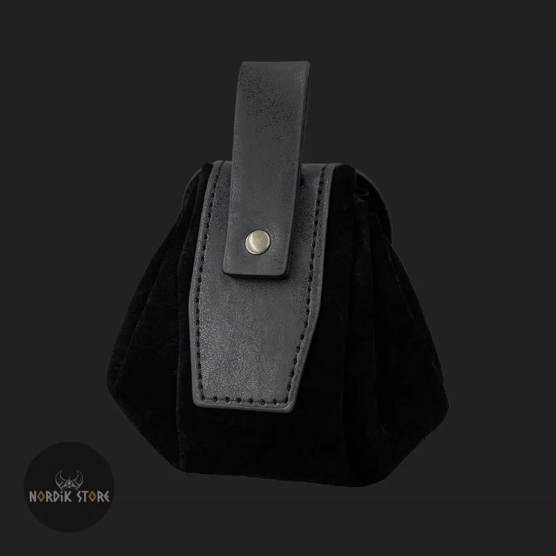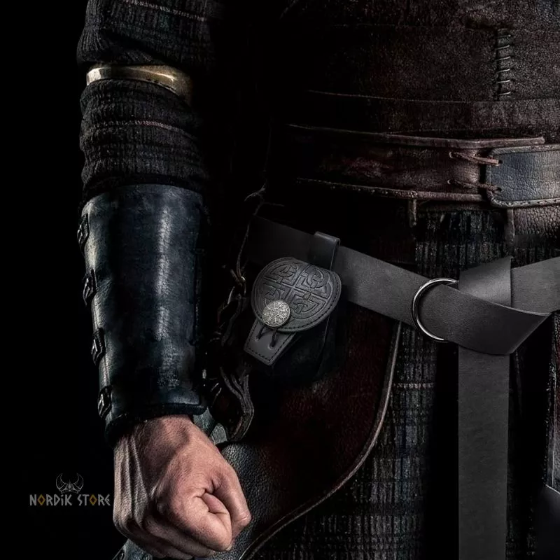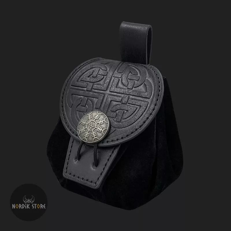 Les entrelacs gravés sur la bourse rappellent l’unité des mondes et la continuité du destin. Chaque courbe s’enlace comme les chemins de la vie. De plus, le bouton orné de runes renforce l’aspect rituel de l’objet. Autrefois, ces symboles accompagnaient marchands, guerriers et voyageurs dans leurs périples.