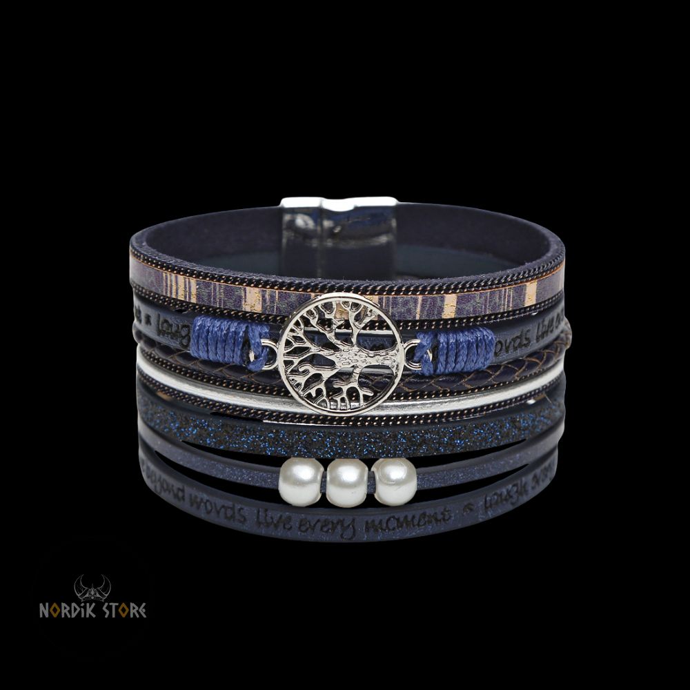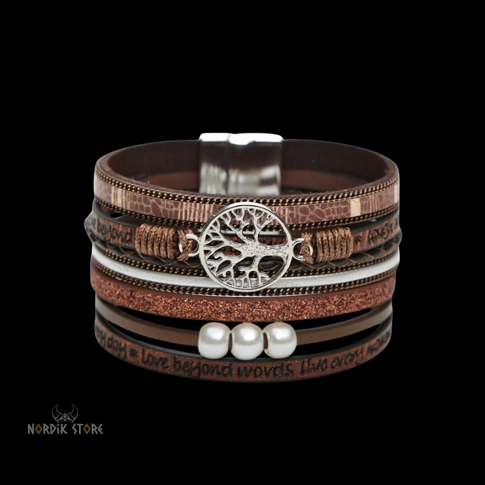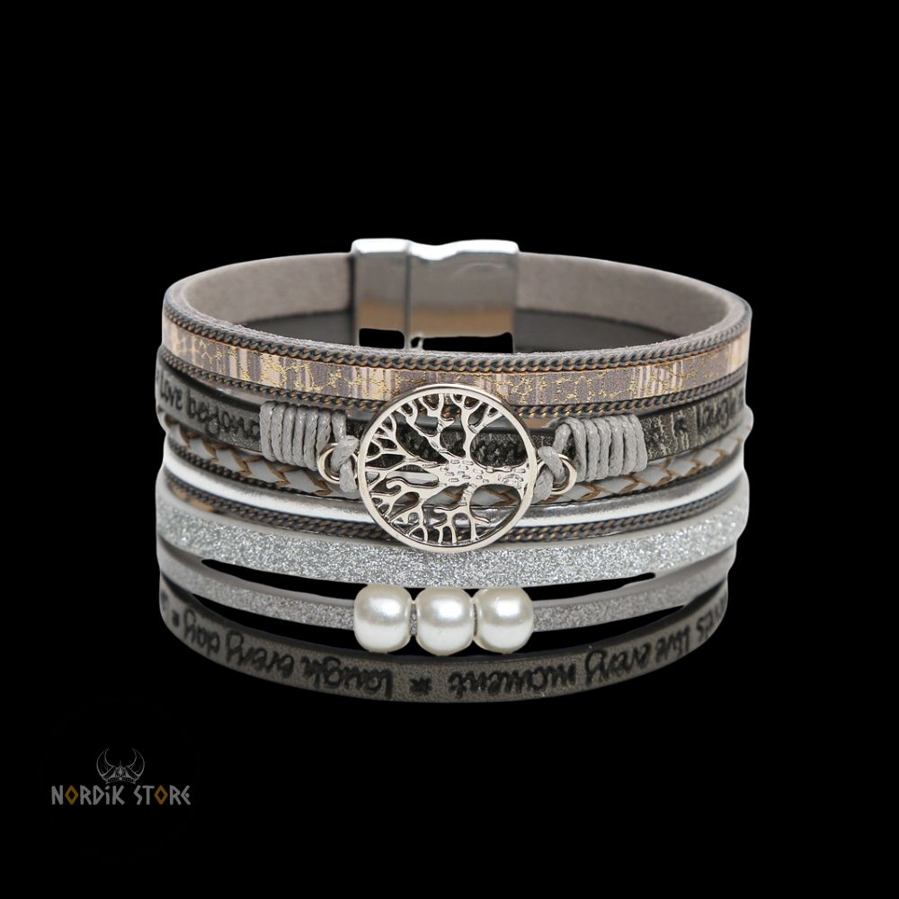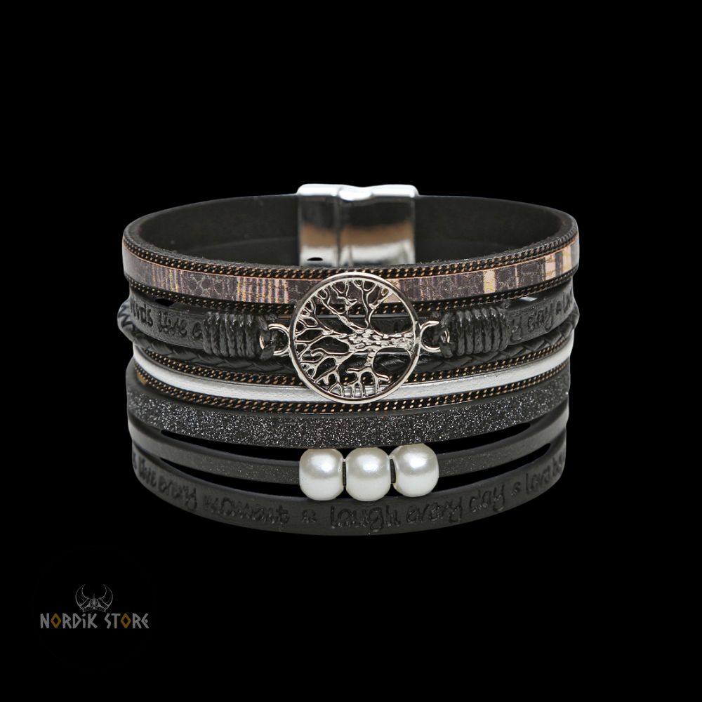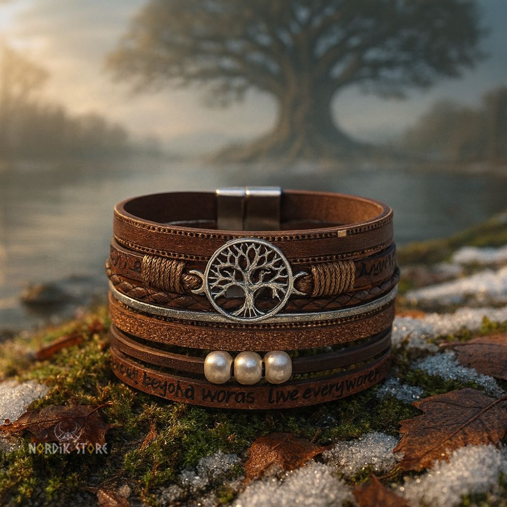 Vous avancez sur un sentier couvert de brume, le vent froid portant le parfum du sel et des pins. À votre poignet glisse un bracelet serti de perles gravées de l’Yggdrasil, l’Arbre-Monde. Le cuir usé frotte doucement contre votre peau, éveillant le murmure des Neuf Royaumes. Vous sentez soudain la gravité de la terre, la vastitude du ciel et la profondeur des racines sous vos veines. Ce simple bracelet ne vous lie plus seulement à votre poignet : il vous rattache aux sagas anciennes et à la nature éternelle.