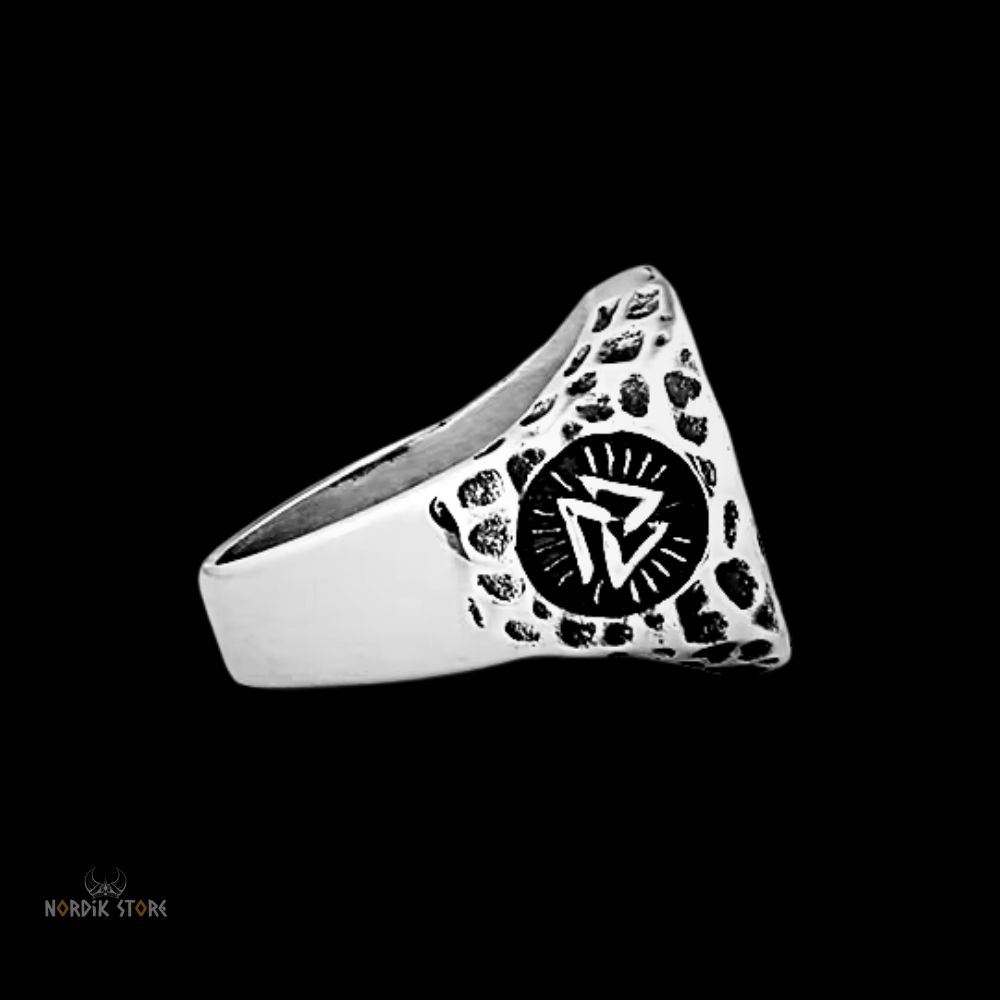 La bague viking Valknut poinçonnée est un bijou qui reflète la puissance et la force des guerriers vikings. Cette chevalière à l'aspect brut et poinçoinnée est fabriquée en acier inoxydable de qualité supérieure de couleur argent antique, résistant à la corrosion et durable dans le temps.