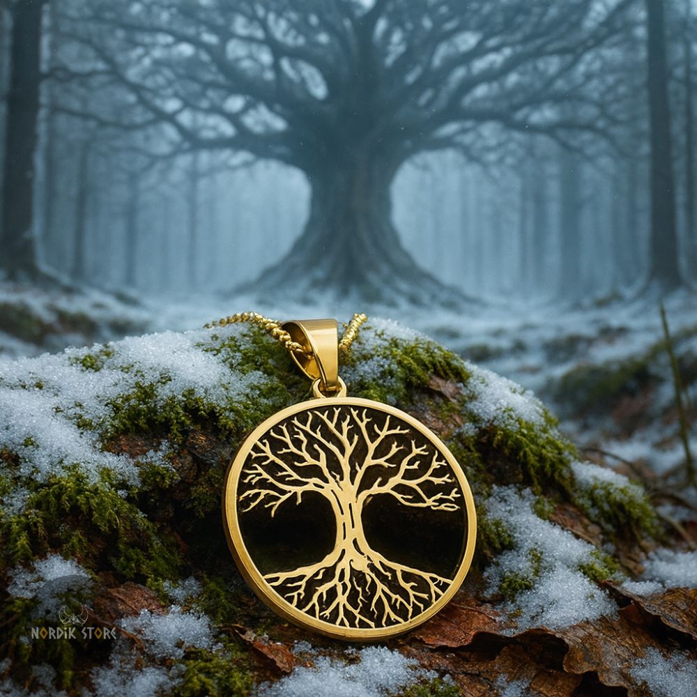 Vous marchez sous un ciel bas, où l’air sent la pluie et le feu de bois. À votre cou pend un collier gravé de l’Arbre de Vie Yggdrasil, ses branches semblant atteindre les étoiles elles-mêmes. Le métal froid frôle votre peau, et soudain vous sentez l’énergie des neuf royaumes vibrer dans vos veines. Le vent murmure des légendes anciennes, des drakkars engloutis et des runes oubliées. Vous portez un pont entre le monde des vivants et celui des dieux.