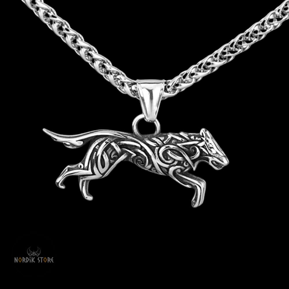 Le collier viking Sköll est un hommage à l'un des loups légendaires de la culture nordique. Ce collier est orné d'un pendentif en forme de loup qui court. Avec sa chaîne en acier inoxydable et sa finition en argent antique, ce collier est un accessoire intemporel et élégant.