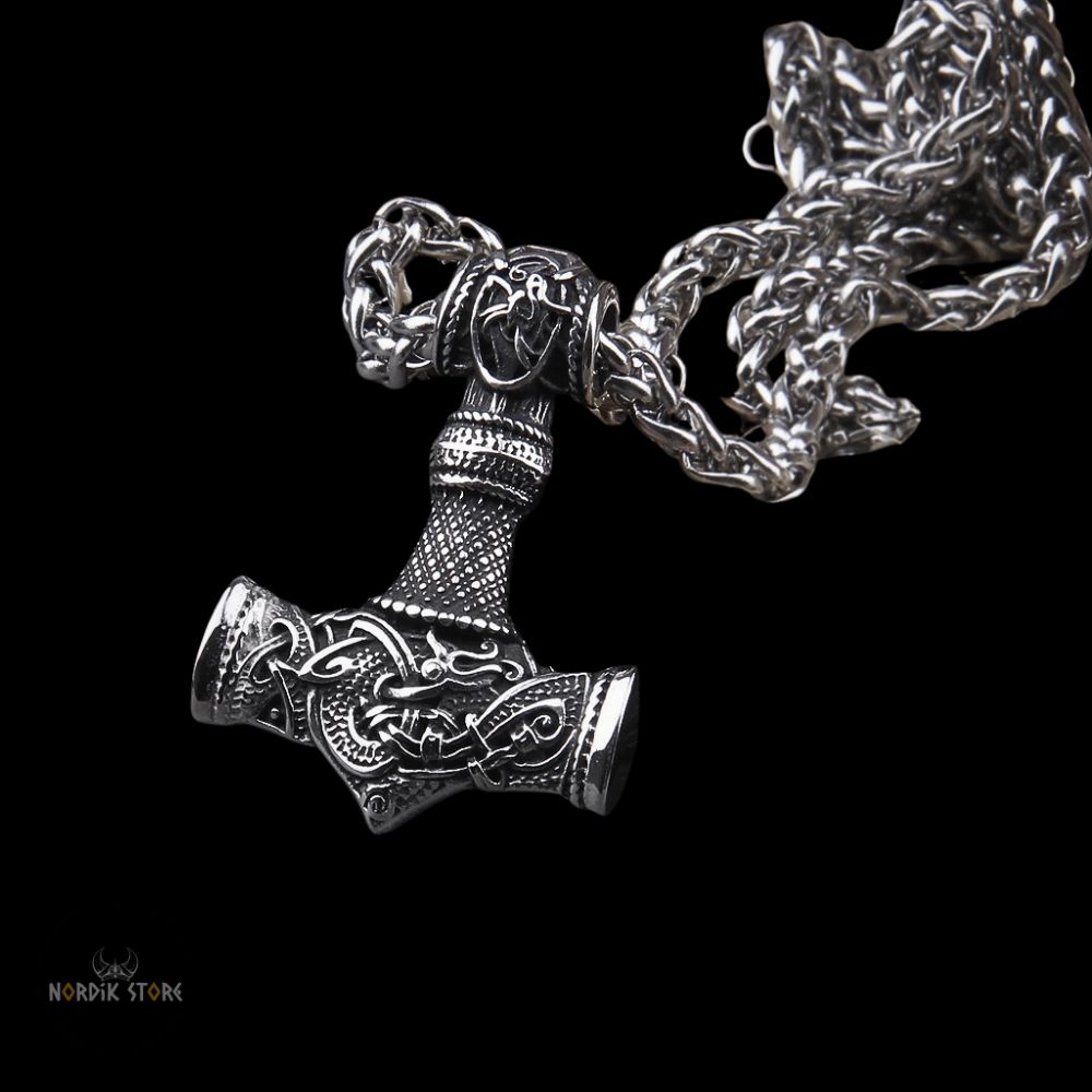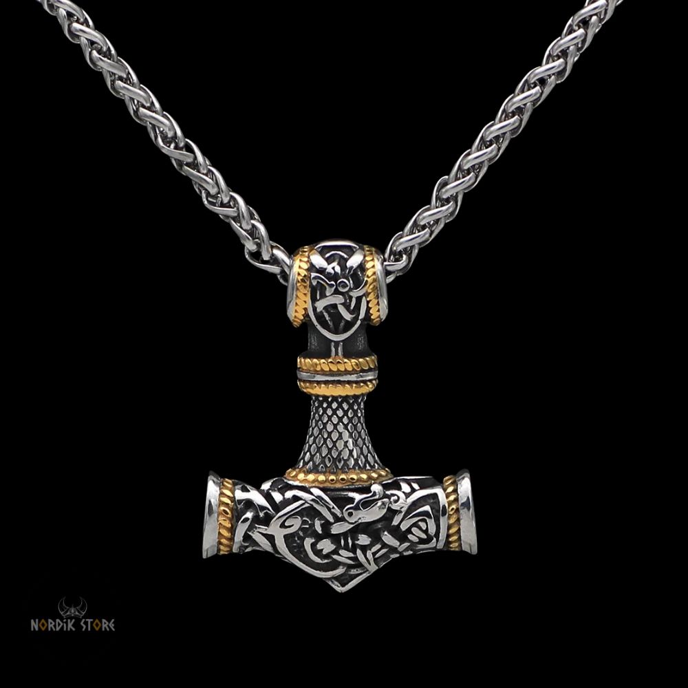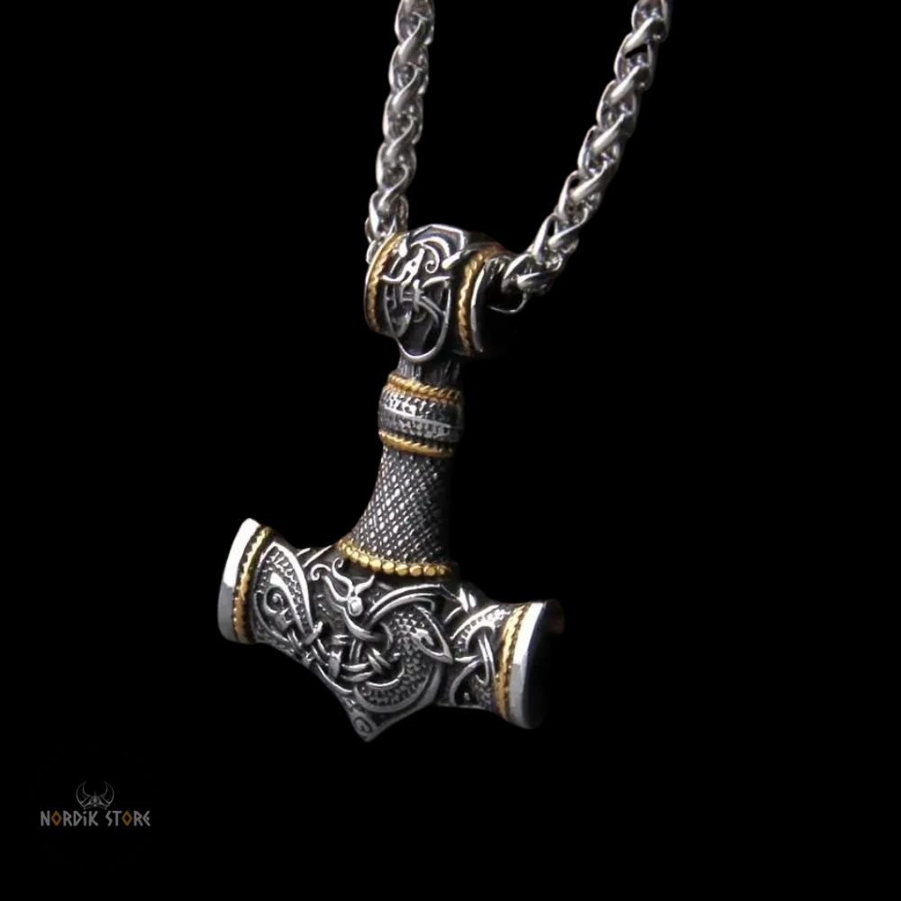 Voici une pièce de bijouterie exceptionnelle inspirée de la mythologie nordique. Chargé d'histoire et de symbolisme, ce collier est un hommage au puissant dieu Thor, connu pour sa force, son courage et sa maîtrise de la foudre.