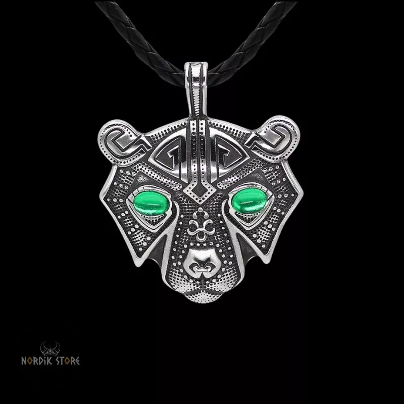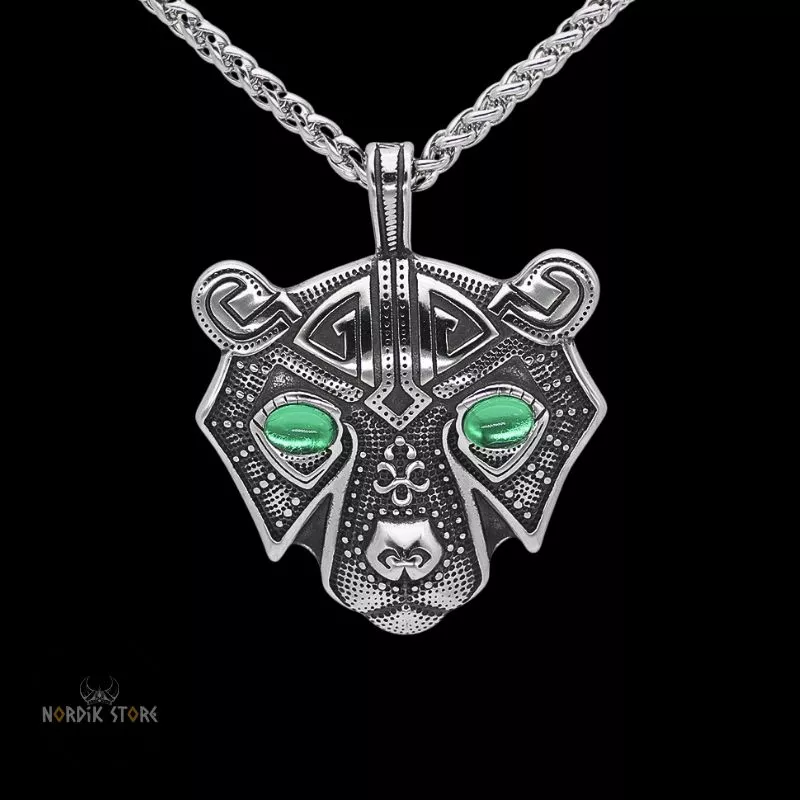 Notre collier viking ours d'Odin vous immerge dans le monde des guerriers légendaires, les berserkers, redoutés et respectés pour leur férocité en bataille. Les yeux de l'ours sont sertis de pierres éméraude ou opaline noire, conférant à chaque pièce un regard intense et perçant. La chaîne de 60 cm, disponible en acier ou en cuir de vachette tressé, apporte la robustesse nécessaire à ce bijou inspiré des Vikings.
