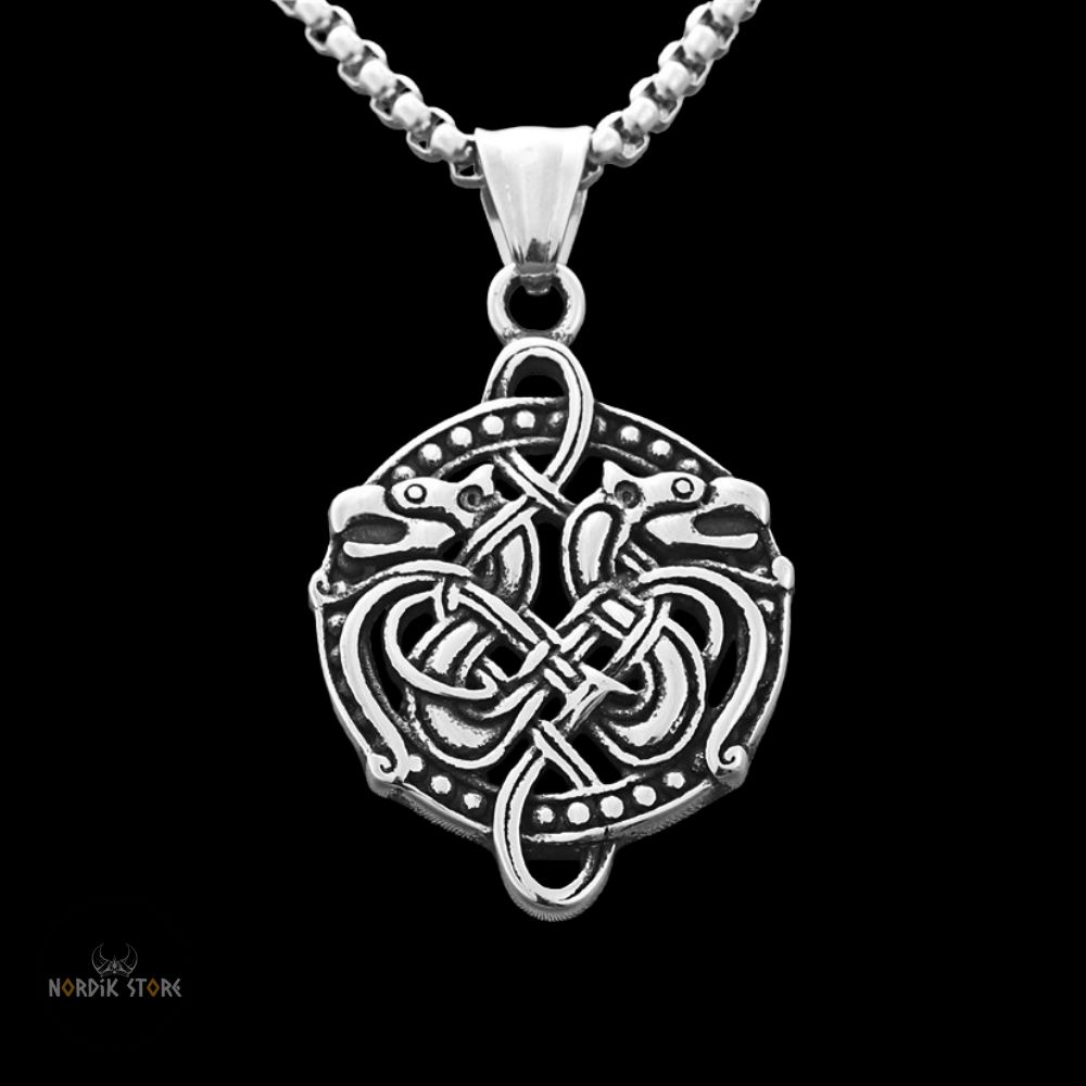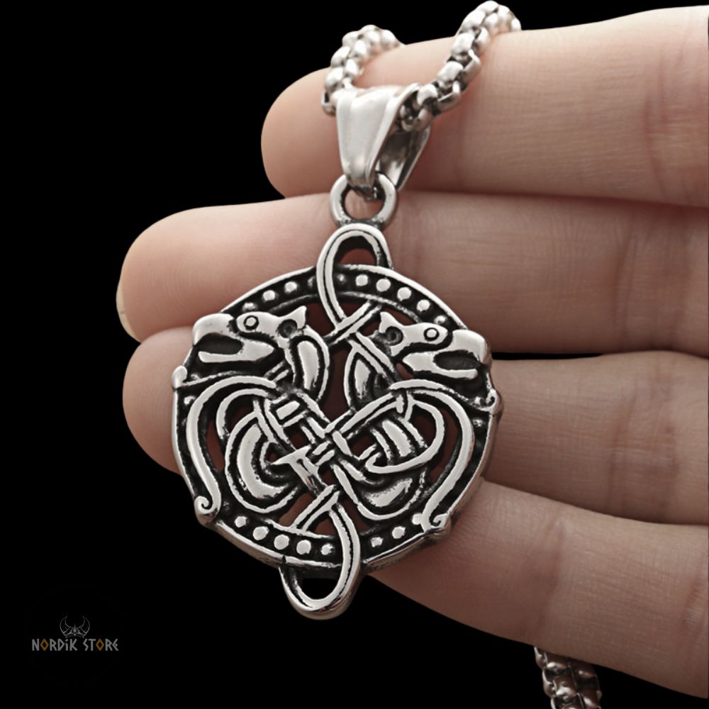 Notre pendentif est finement sculpté, représentant des dragons vikings entremêlés d'entrelacs. Le dragon, dans la culture viking, est un gardien et un guide. L'entrelacs ajoute une touche de complexité, symbolisant le chemin sinueux de la vie.