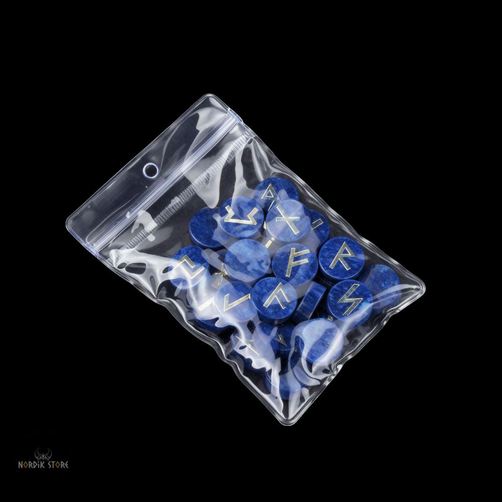 - Composition : 25 runes gravées en pierre naturelle de lapis-lazuli.