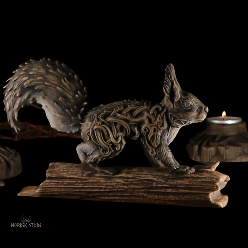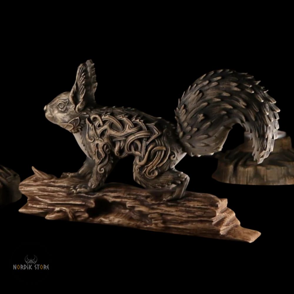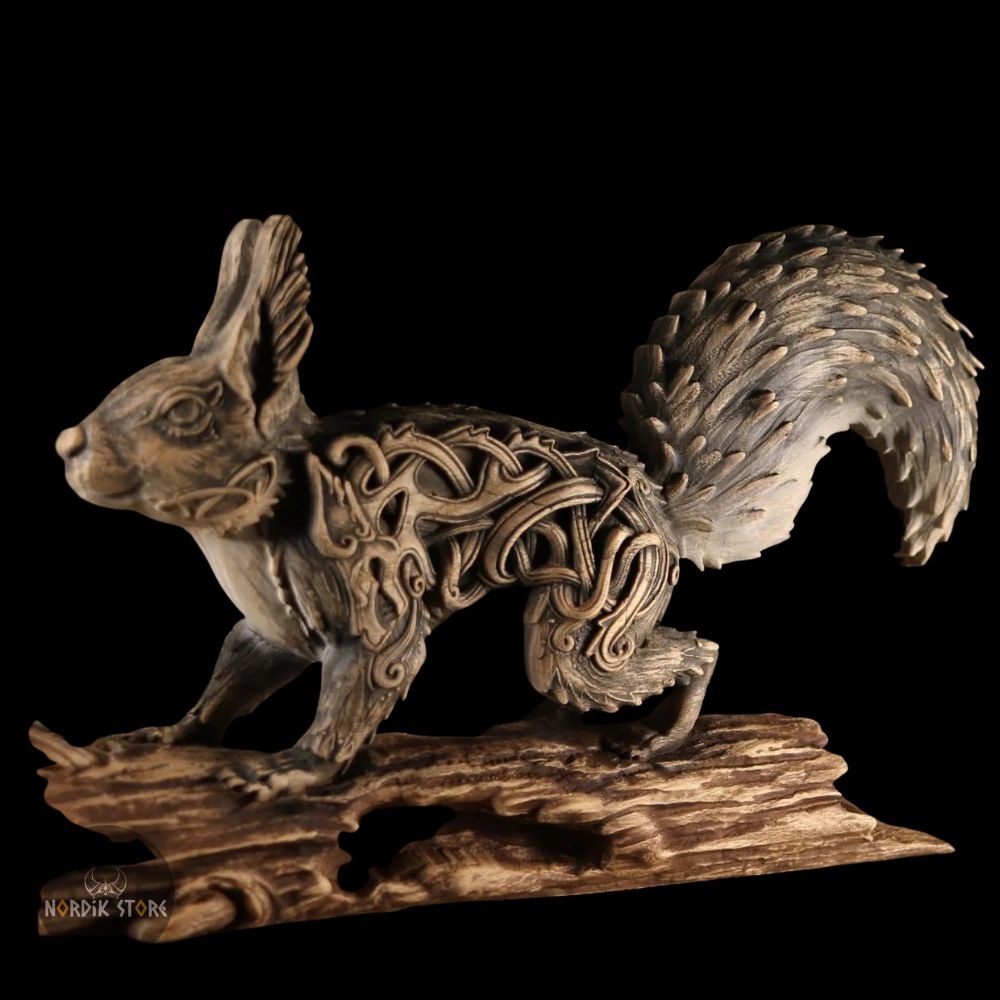 Une statue viking Écureuil Ratatoskr chargée de symboles nordiques