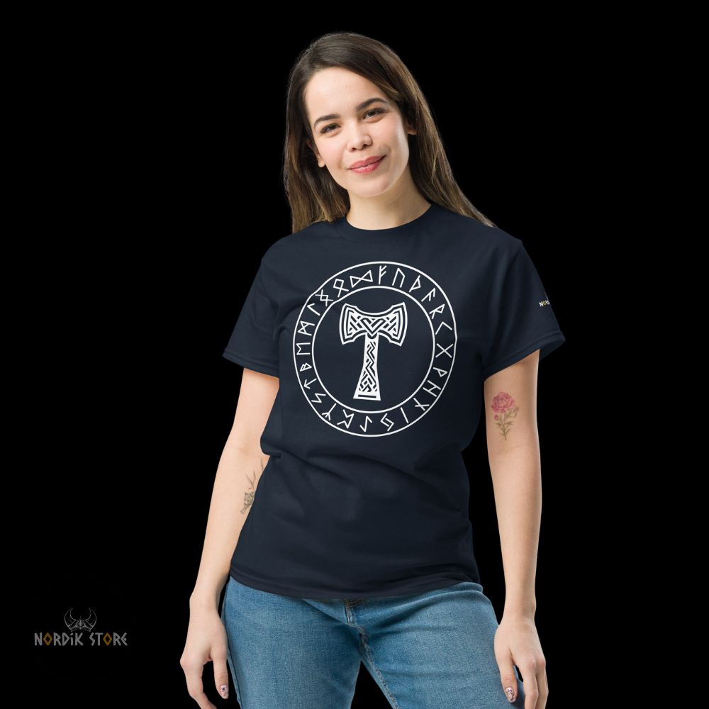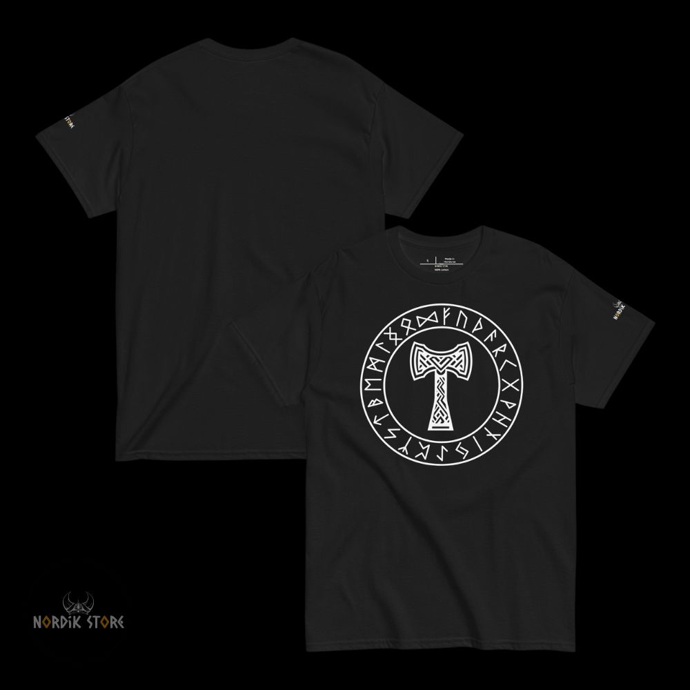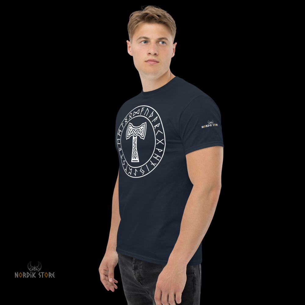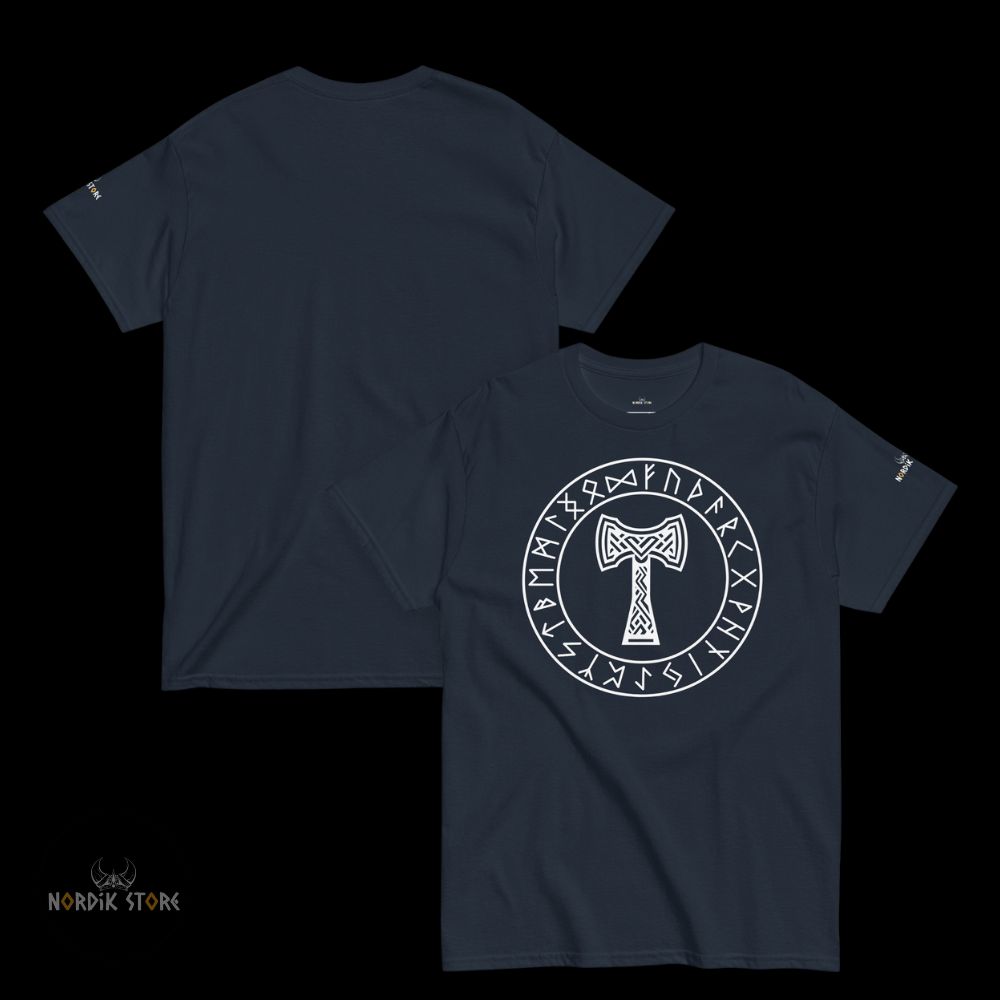 Le dessin du marteau sacré rappelle la mythologie viking, où Thor maniait Mjolnir pour défendre les dieux et les hommes. Cet emblème reste puissant. Il inspire respect. Grâce au contraste du T-shirt noir ou bleu marine, le symbole ressort nettement. En portant ce t-shirt Mjolnir, vous adoptez la stature d’un guerrier du Nord. Ce style affirme votre attachement à la culture viking ou à la symbolique du dieu du tonnerre. Les runes présentes autour du marteau renforcent la profondeur spirituelle du design. Ce mélange unique séduit les passionnés et les amateurs de mode nordique.