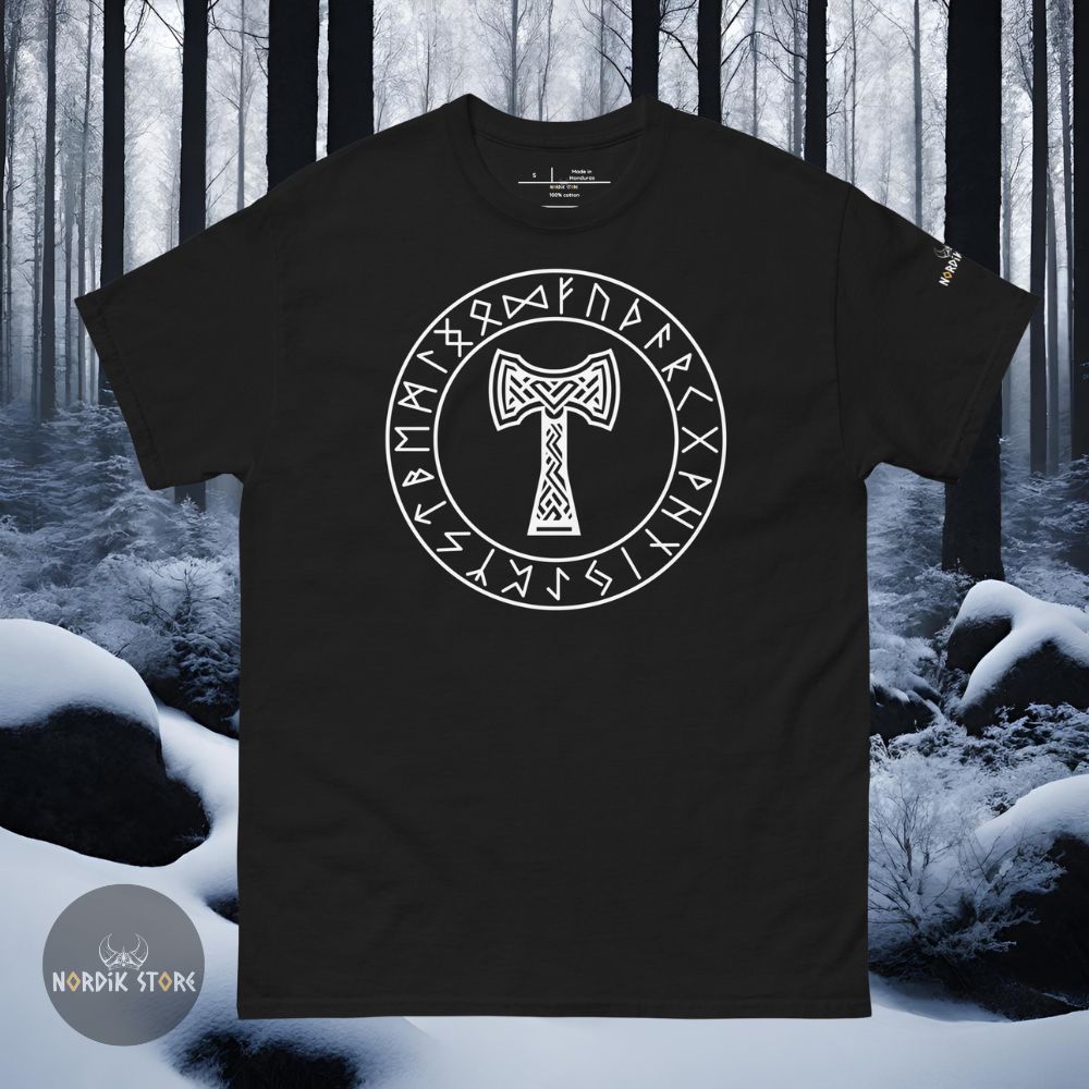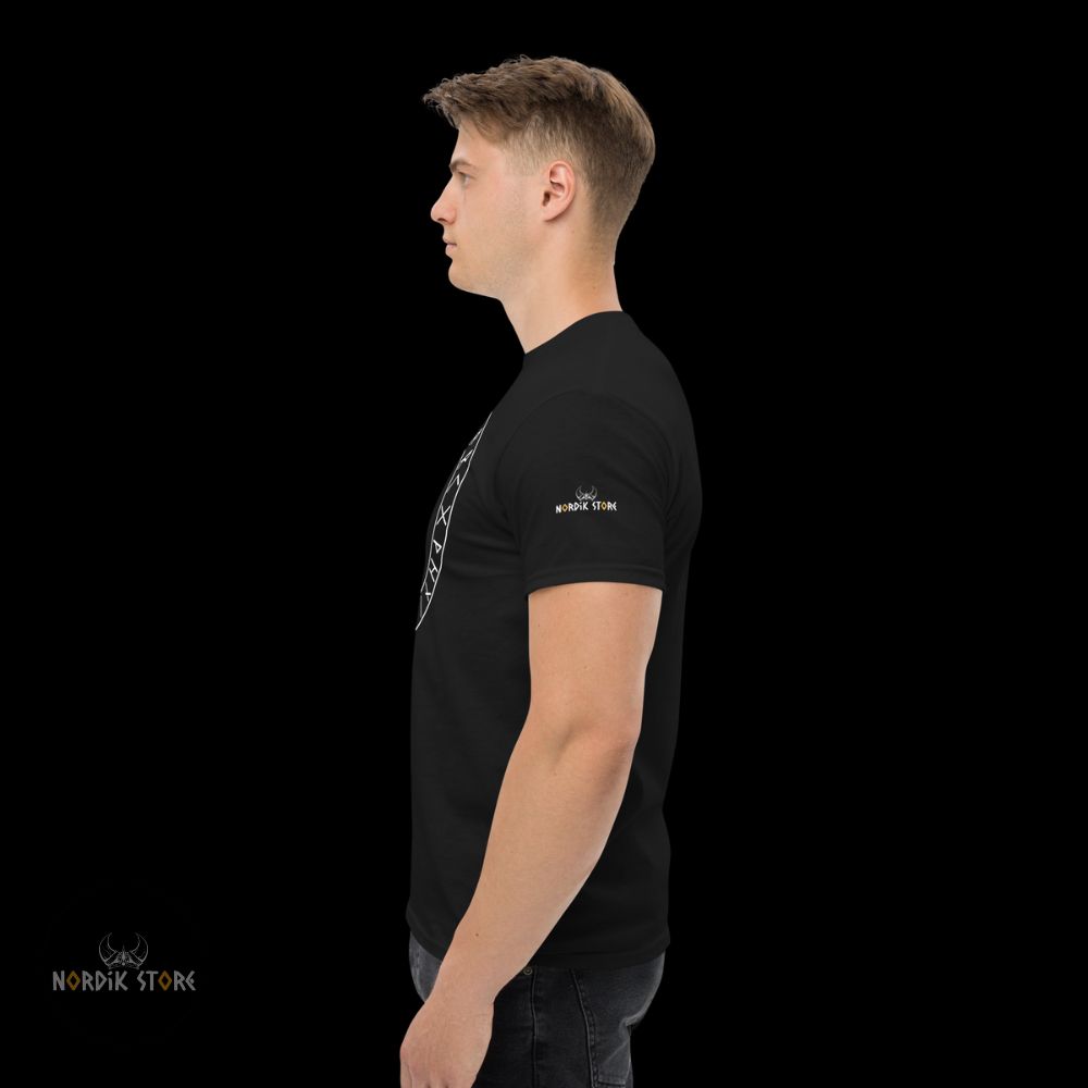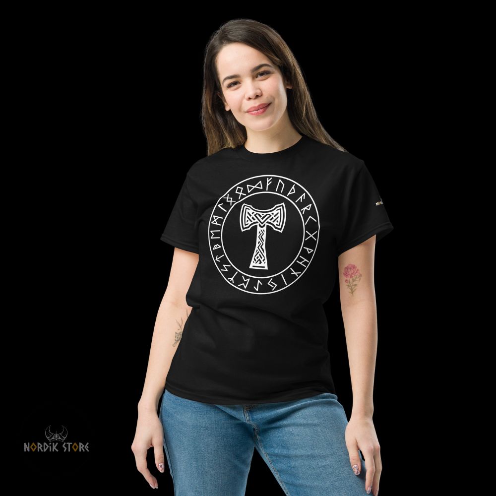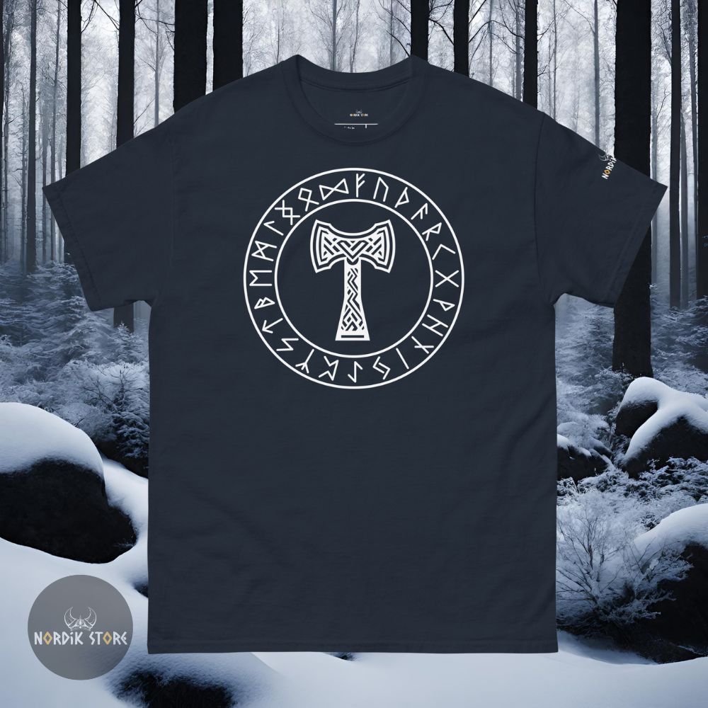 Le dessin du marteau sacré rappelle la mythologie viking, où Thor maniait Mjolnir pour défendre les dieux et les hommes. Cet emblème reste puissant. Il inspire respect. Grâce au contraste du T-shirt noir ou bleu marine, le symbole ressort nettement. En portant ce t-shirt Mjolnir, vous adoptez la stature d’un guerrier du Nord. Ce style affirme votre attachement à la culture viking ou à la symbolique du dieu du tonnerre. Les runes présentes autour du marteau renforcent la profondeur spirituelle du design. Ce mélange unique séduit les passionnés et les amateurs de mode nordique.