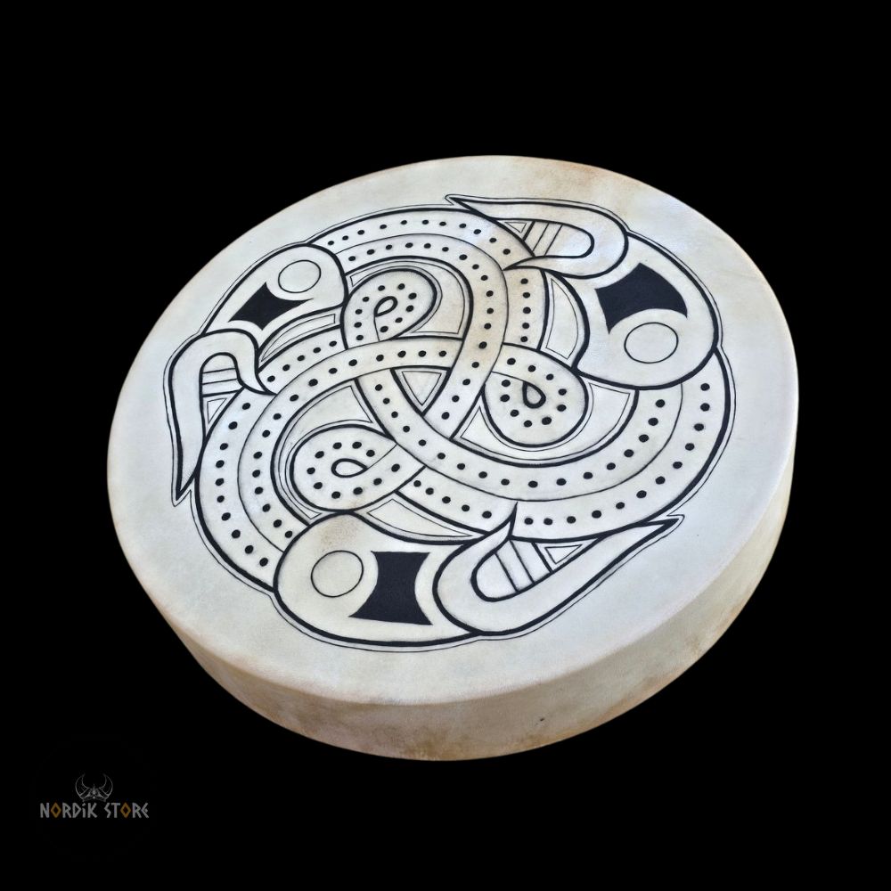 L’art Vendel, présent sur Gotland, influença les premiers Vikings. Ces motifs, souvent animaliers, symbolisaient la force et la continuité. Ce tambour reprend cette tradition. Il crée un lien entre passé et présent. Son rythme évoque les cérémonies anciennes. Il inspire la concentration. Il soutient également l’ancrage.