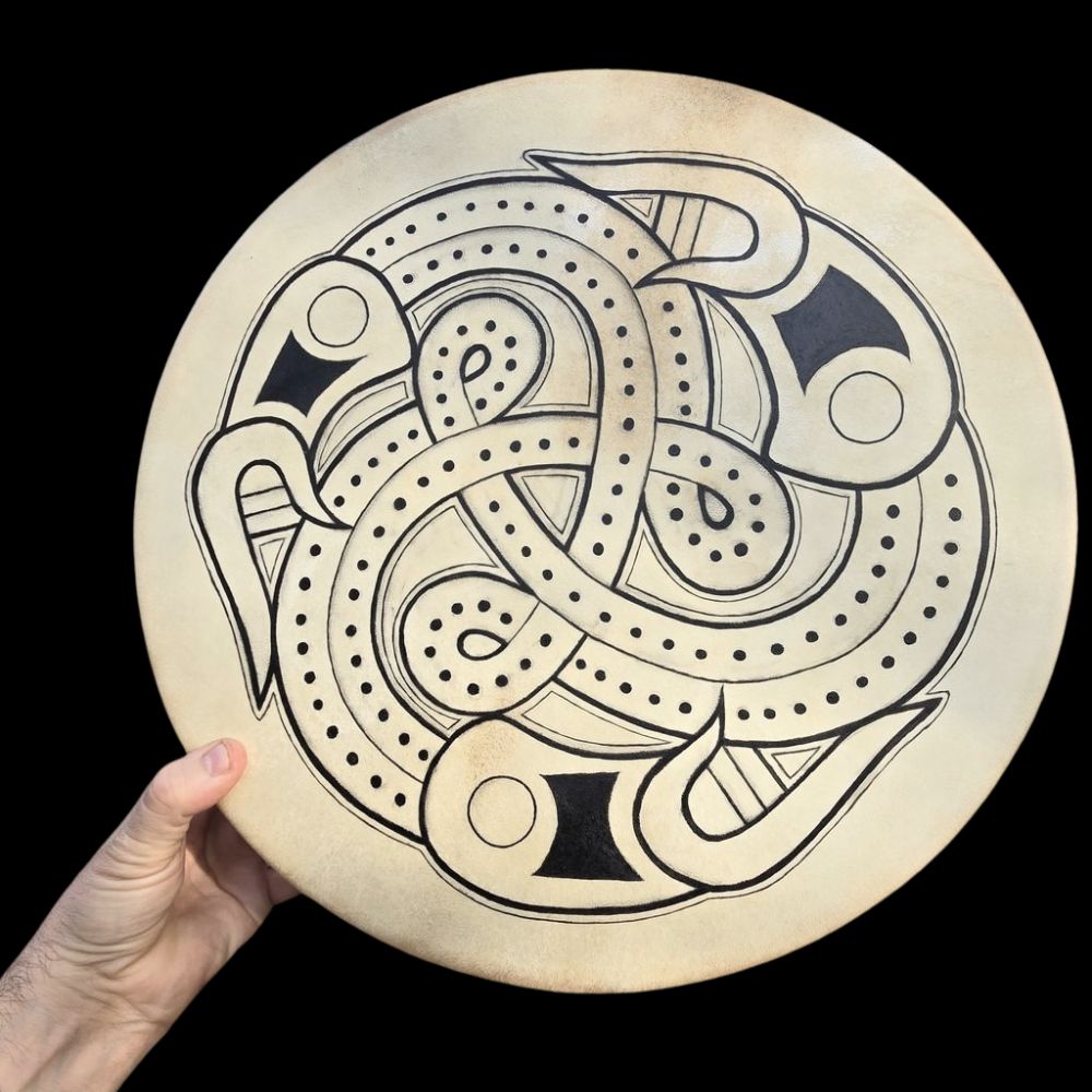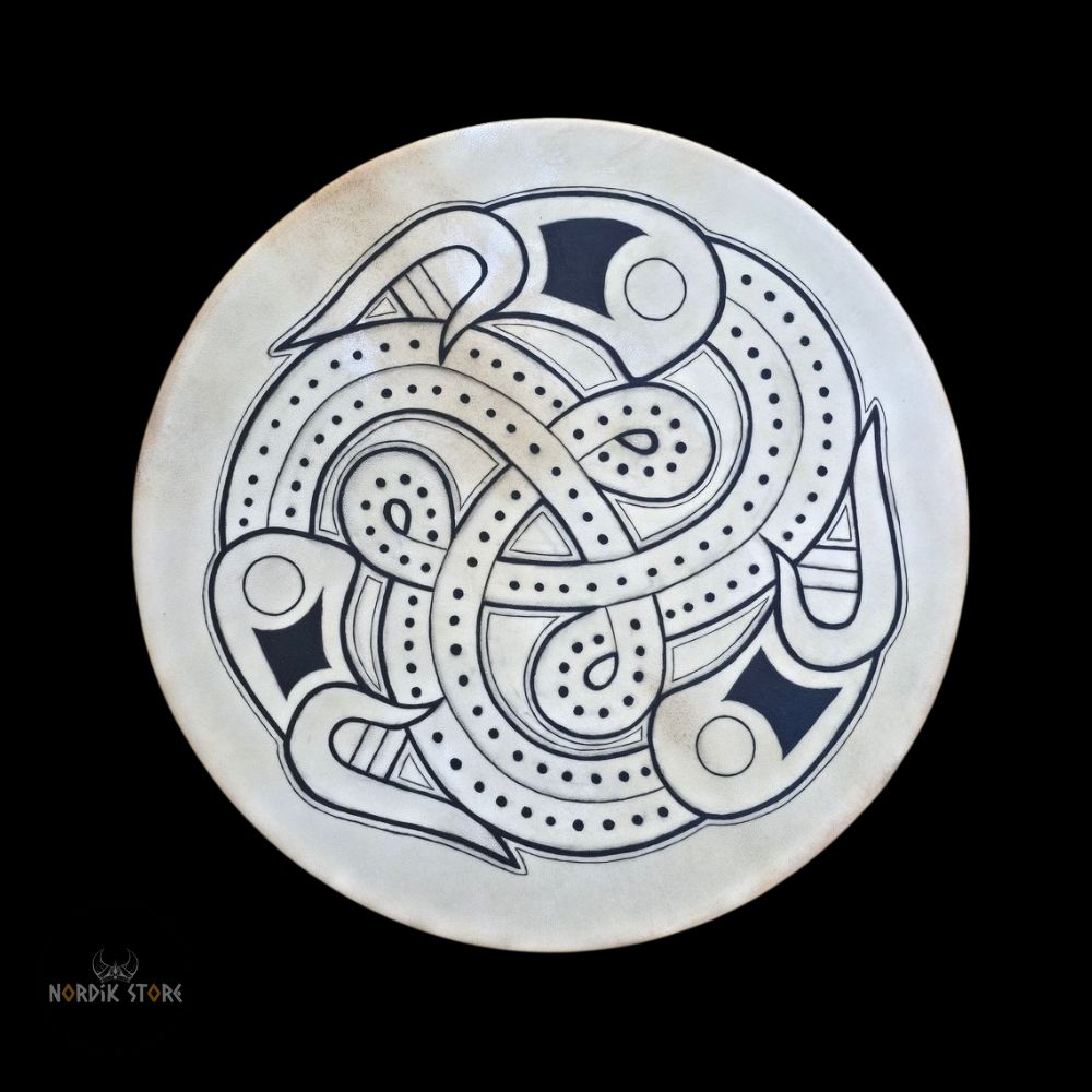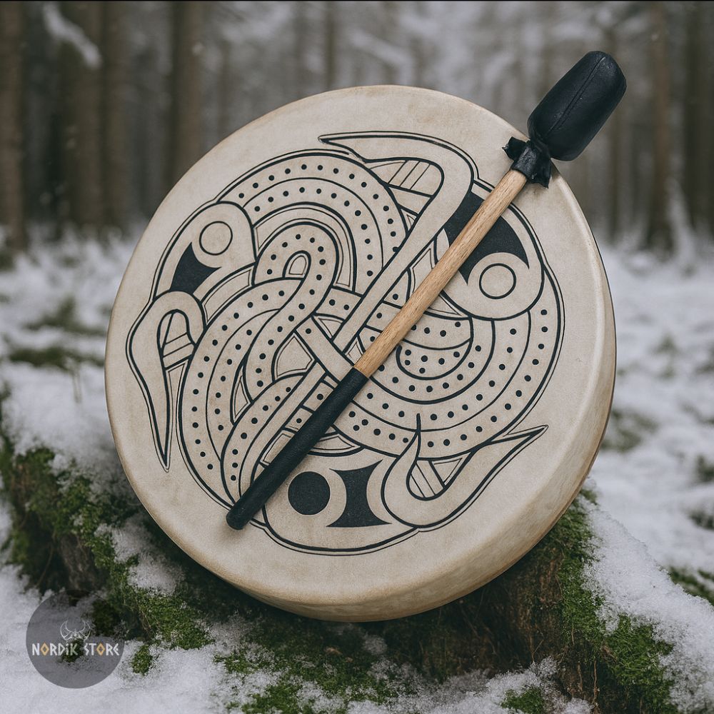 Laissez résonner l’esprit de Gotland : ce tambour chamanique viking ouvre la voie vers les anciens mondes grâce à son motif Vendel sacré.