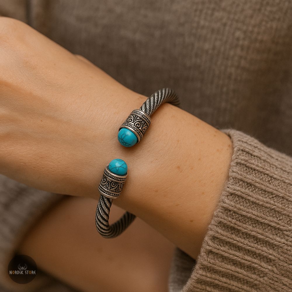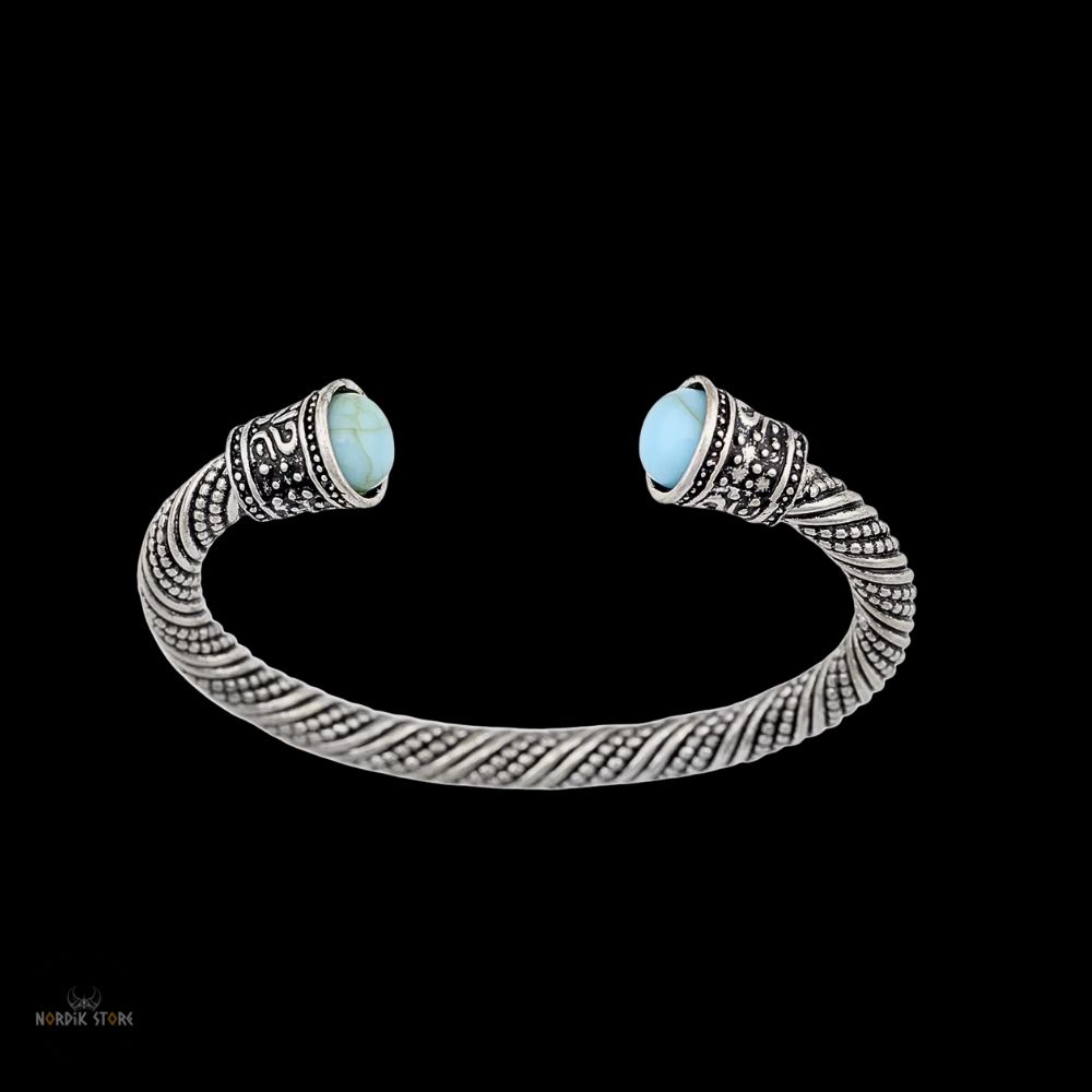 Découvrez un bracelet viking d’exception, inspiré des torques sacrés portés par les guerriers et les prêtres d’Odin. Le torque nordique larmes d’Asgard incarne l’équilibre entre la force divine et la fragilité humaine. La pierre turquoise, symbole d’harmonie et de protection, évoque les larmes versées par les dieux pour les hommes tombés au combat. Dans la mythologie nordique, cette pierre était censée apaiser les esprits et guider les âmes vers le Valhalla.