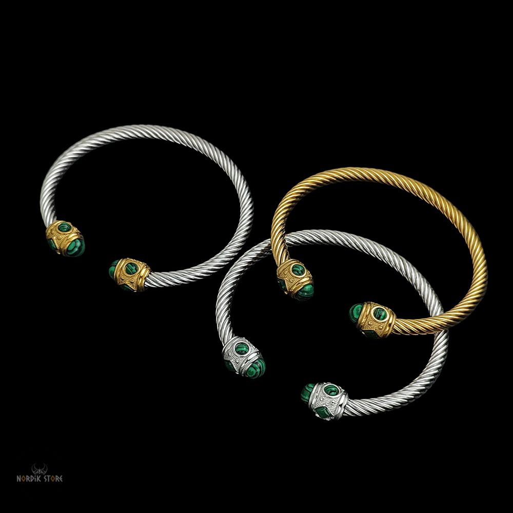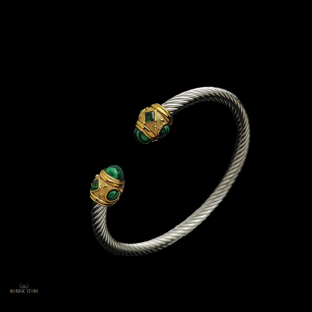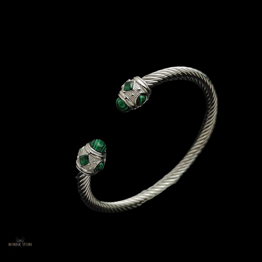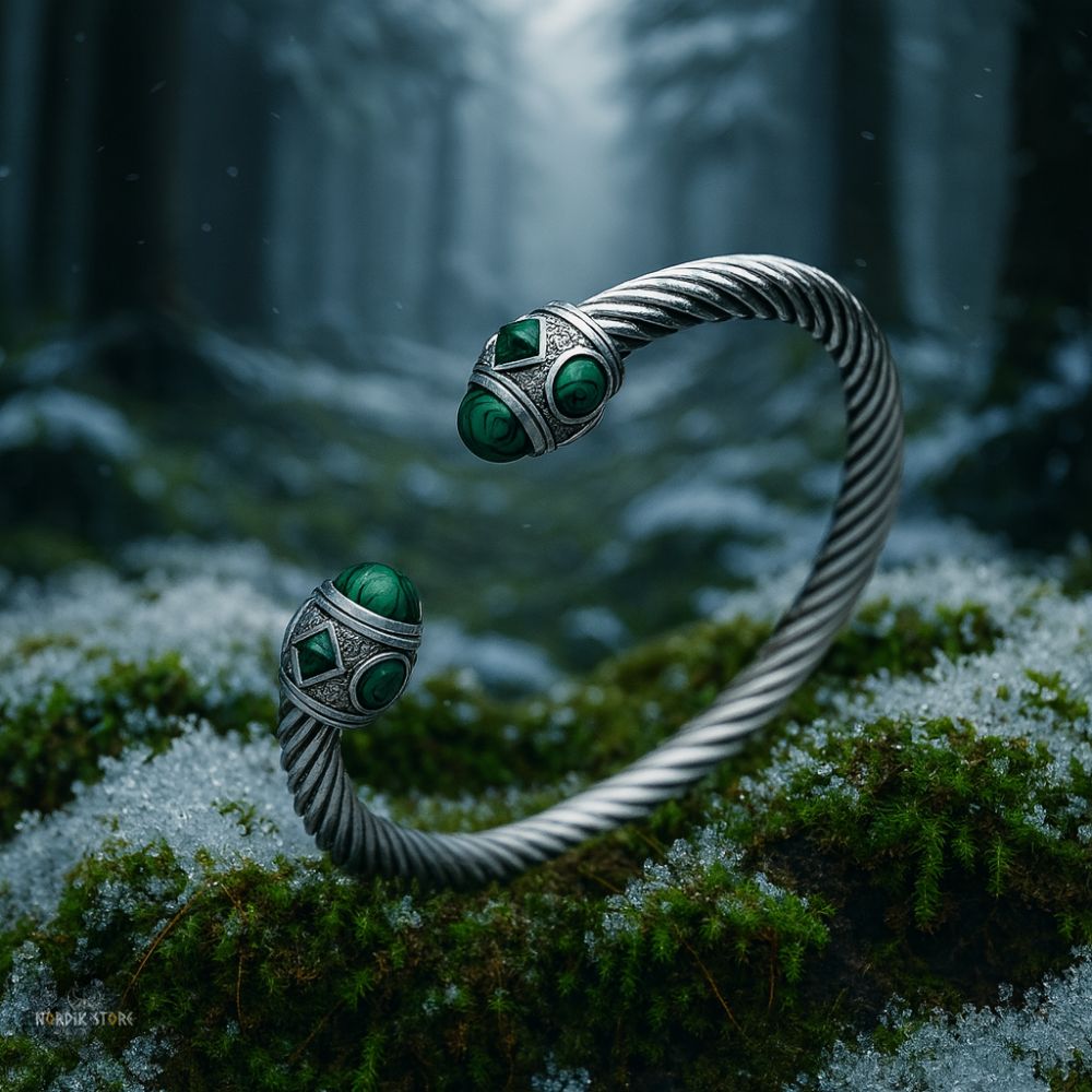 Découvrez un bracelet viking où se mêlent la solidité de l’acier et la profondeur mystique de la malachite. Dans la mythologie nordique, la déesse Jörd incarne la terre nourricière, mère de Thor et gardienne des racines du monde. La pierre verte symbolise la fertilité, la renaissance et la stabilité — des valeurs profondément ancrées dans l’esprit scandinave. L’éclat du Torque Larmes de Jörd évoque les prairies d’été et les forêts d’Asgard, là où la terre et le ciel se rejoignent.
