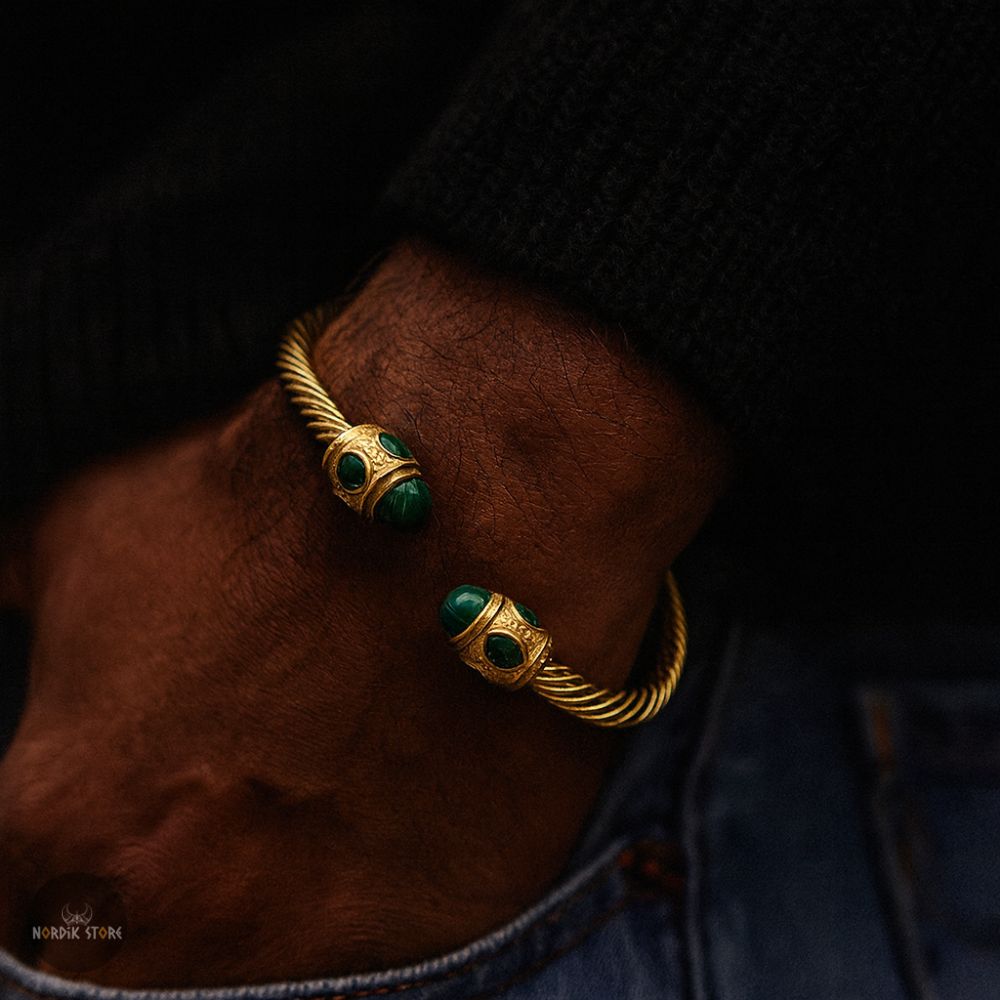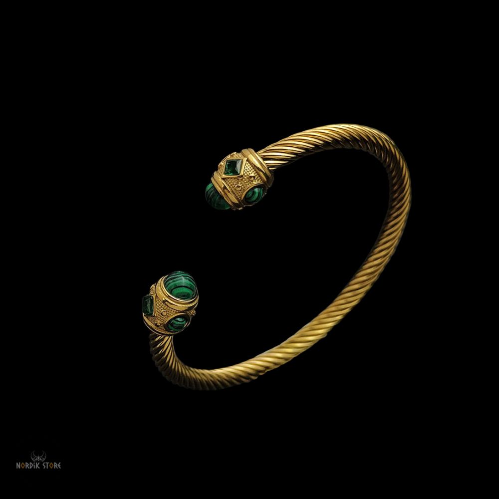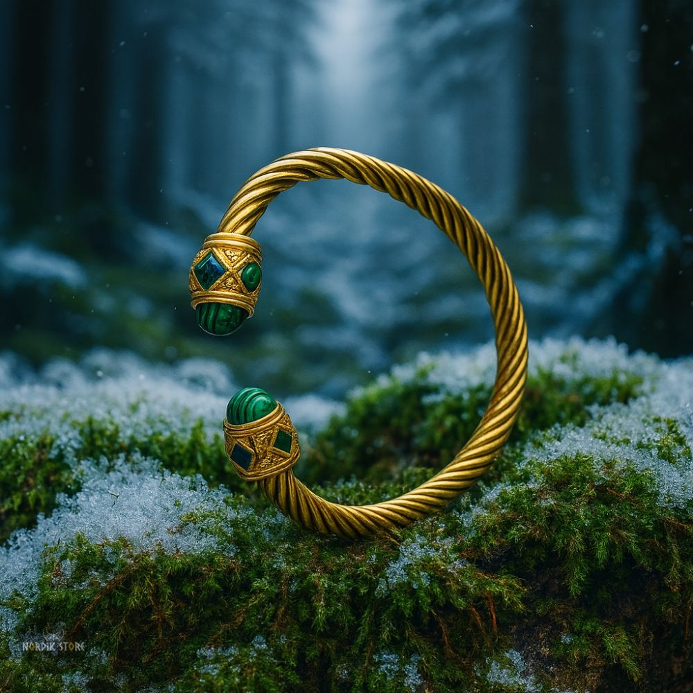 Imaginez la forêt nordique, baignée d’une lumière d’ambre, où chaque souffle de vent porte l’écho des dieux. Au centre du monde, la déesse Jörd — la Terre elle-même — pleure des larmes d’émeraude. De ces gouttes de vie naît le torque viking Larmes de Jörd, bijou forgé dans l’or et la pierre, symbole d’un lien sacré entre la nature et les hommes. Ce torque n’est pas un simple ornement : c’est un talisman, un hommage à la puissance de la vie et à la beauté indomptable du Nord.