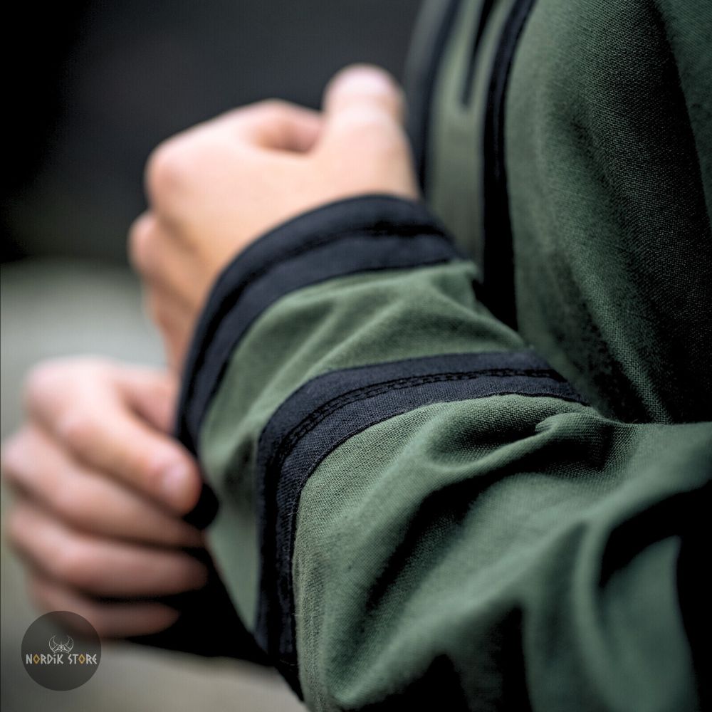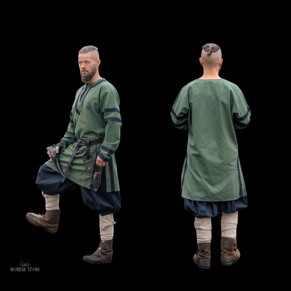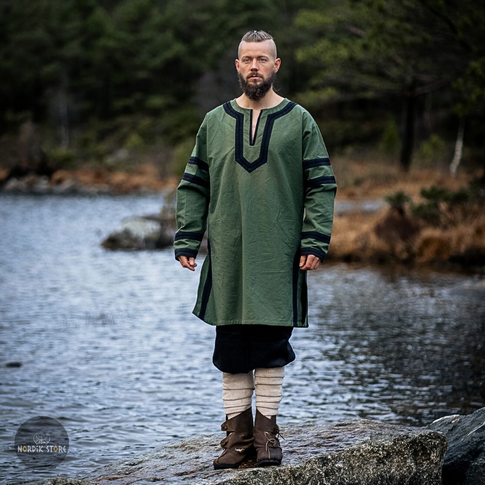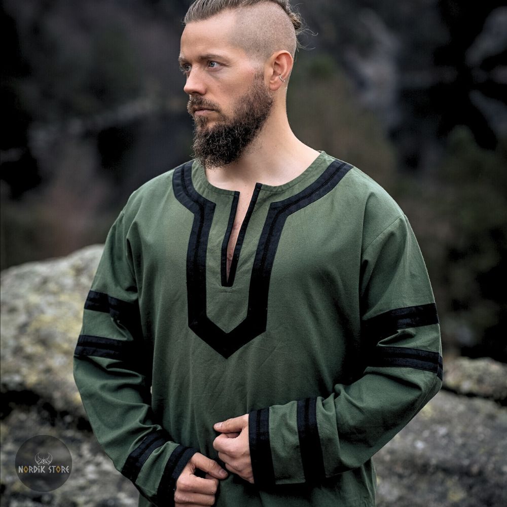La tunique viking Thorvald s’inspire directement des traditions vestimentaires scandinaves médiévales. Les Vikings, connus pour leur sens pratique, portaient des vêtements simples mais élégants, symboles de leur statut et de leur bravoure. Cette tunique verte rappelle la terre fertile de Scandinavie, berceau de légendes et de conquêtes. Son encolure en V ornée de motifs raffinés évoque la finesse artisanale du Nord, où chaque couture avait un sens spirituel et esthétique.
